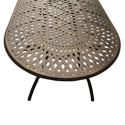 Constructed of cast aluminum in UV resistant, powder coated, hand applied bronze finish, this large oval 95 inch dining table set with 10 cast aluminum rose dining chairs features a top that is designed specifically to prevent damage caused from pooling by allowing water to pass through freely. Made specifically for large families or entertaining guests, this mesh lattice mordern contemporary and ornate traditional oval oblong dining table set is ideal for any outdoor patio, porch, deck, balcony and backyard. Suitable for indoor or outdoor and commercial or residential use.