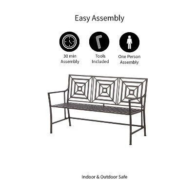 Update your garden decor with this unique garden bench. Constructed from iron, the powder coated bronze finish on this bench keeps from rusting in the elements. The intricate metal back features square cut-outs for a distinct addition to your home. This bench measures approximately 53.54 x 22.63 x 35.82 inches and requires some assembly upon arrival.