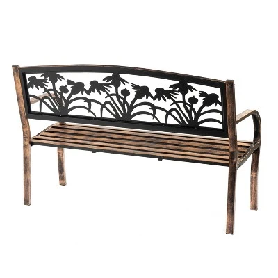 This Coneflower Metal Garden Bench is as pretty as a garden itself, a work of art as well as high-quality outdoor seating. Generously sized and perfect for two, this unique bench is the perfect spot to relax and enjoy your garden, a nice view or a good book, plus it’s a great value for outdoor furniture. This functional and decorative garden furniture features a beautifully detailed back with coneflowers and a classic slatted seat. It’s a must-have for your porch, deck or garden—even in a sunroom or mudroom. Sturdy steel frame has a deep bronze finish. A slatted seat and rounded arms add to the timeless appeal. All-weather powder coat. Easy assembly.