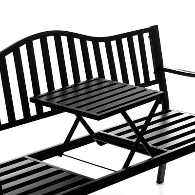 This outdoor park bench is a versatile and functional seating option that is perfect for any outdoor space, such as yards, patios, gardens, balconies, and decks. The bench is made with a durable steel frame that is powder coated to resist rust and corrosion, ensuring that it can withstand the elements and provide long-lasting support. It has a maximum capacity of 500 pounds, making it a reliable seating option for multiple users. The bench features a unique design that includes a pop-up middle table, perfect for holding drinks, snacks, or other small items. This feature adds to the functionality of the bench and makes it a convenient choice for outdoor gatherings and events. The design is simple and modern, with clean lines and a sleek finish that can complement any outdoor decor style. The bench is easy to assemble and comes with all the necessary hardware, making it a hassle-free addition to your outdoor space. Whether you are looking to create a cozy seating area in your garden or want to add some functionality to your patio or deck, this park bench is an excellent choice.