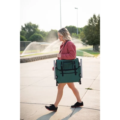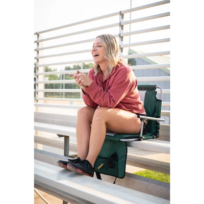 Our Folding Stadium Seat has a padded seat and backrest that can transform a hard bleacher into a soft place to sit. Features an adjustable shoulder strap for portability, steel tubular-frame for strength and durability, and a lower pocket and large storage pocket on the backrest that is ideal for holding larger materials. Collapsible design with steel hooks on the bottom that can securely attach the seat to all types of bleachers.
