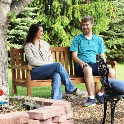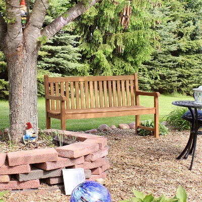 With its eye-catching, classic style, this 2-person, outdoor patio or garden bench is great for enjoying any outdoor living area with friends and family! This bench will look beautiful in any patio, deck, lawn, garden, terrace, yard, or any other outdoor space for joyful relaxation. While sitting on this bench it is easy to showcase your beautiful gardens or outdoor spaces. This bench has a teakwood construction and is finished with a light brown stain for increased weather resistance and strength. When the weather gets rainy, make sure to bring in your benches or cover them for further long-lasting life! The back of this bench has a wooden, vertical bar design with solid, light legs, and a seat for a classic, sleek style that is sure to complement any natural, contemporary, or modern aesthetic. Place this bench anywhere to your liking, invite a friend over, and bask in the stunning sunshine.