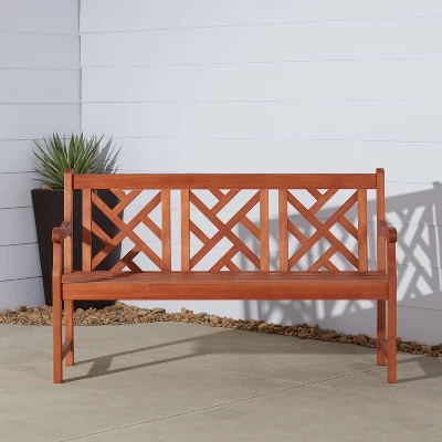Relax and enjoy the beauty of your garden on this Eucalyptus Outdoor Wood Bench from Vifah. The outdoor bench offers comfortable seating and features a slatted design with armrests, while the crosshatched back complements the fanciful beauty of your treasured plants and blooms. The wooden bench creates a cool, relaxed look, perfect for everyday use and hosting get-togethers. We’re committed to making products better for you, and the world.