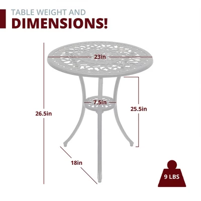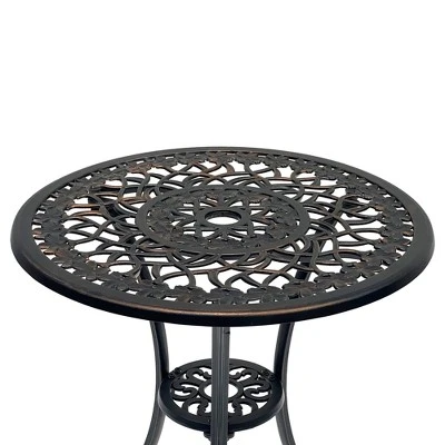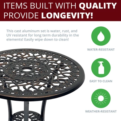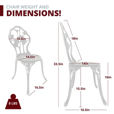Add a touch of sophisticated style to your patio with the Kinger Home Zia 3-Piece Bistro Table Set. Made from cast aluminum, this durable set is water, rust, and fade resistant with an oil-rubbed bronze finish for a timeless look that is designed to withstand the elements year-round. A round table features delicate filigree and scrollwork, while the two matching bistro chairs are covered in a timeless floral design. Designed for compact spaces, the small patio furniture set is perfect for an apartment balcony. Accessorize your outdoor bistro set with a 1.75″ patio umbrella or add a chair cushion for an enhanced outdoor living experience.